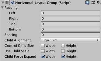 # Horizontal Layout Group The Horizontal Layout Group component places its child layout elements next to each other, side by side. Their widths are determined by their respective minimum, preferred, and flexible widths according to the following model: * The minimum widths of all the child layout elements are added together and the spacing between them is added as well. The result is the mimimum width of the Horizontal Layout Group. * The preferred widths of all the child layout elements are added together and the spacing between them is added as well. The result is the preferred width of the Horizontal Layout Group. * If the Horizontal Layout Group is at its minimum width or smaller, all the child layout elements will also have their minimum width. * The closer the Horizontal Layout group is to its preferred width, the closer each child layout element will also get to their preferred width. * If the Horizontal Layout Group is wider than its preferred width, it will distribute the extra available space proportionally to the child layout elements according to their respective flexible widths. For more information about minimum, preferred, and flexible width, see the documentation on [Auto Layout](UIAutoLayout.md). ## Properties ![](images/UI_HorizontalLayoutGroupInspector.png) |**Property:** |**Function:** | |:---|:---| |**Padding** |The padding inside the edges of the layout group. | |**Spacing** |The spacing between the layout elements. | |**Child Alignment** |The alignment to use for the child layout elements if they don't fill out all the available space. | |**Control Child Size** |Whether the Layout Group controls the width and height of its child layout elements.| |**Use Child Scale** |Whether the Layout Group considers the scale of its child layout elements when sizing and laying out elements.